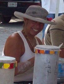 Above: Christy helps the local kids mosaic small pillars for the community park produced completely of recycled material. Click photo for more details.